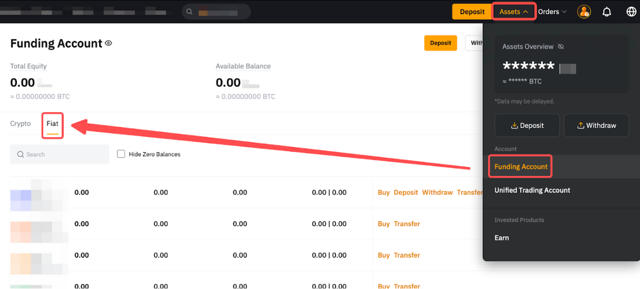 Please click on Assets → Funding Account to view your purchased fiat currency under Fiat.