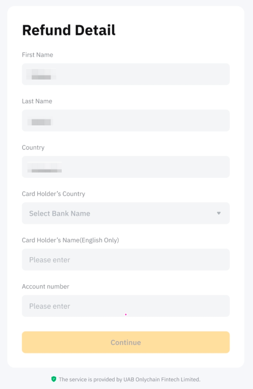 When a refund is required, you will need to submit the refund details on the Buy Crypto Order page → Fiat deposit → hover to the Refund Processing and click on Submit. Alternatively, you may also find the submission portal here. Please follow the instructions and submit the relevant documents which will be reviewed within 48 hours. Then, the refund process will take approximately 7-14 business days for the bank to refund.
