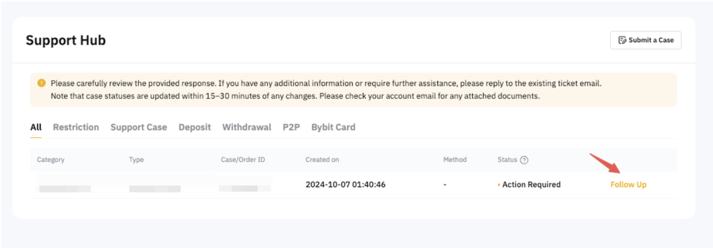 If you receive a message asking for more information or encounter a Risk Warning pop-up message, please click on Submit. You will be redirected to a page where you can submit the requested documents. Alternatively, you can also find the submission tickets in the Support Hub.