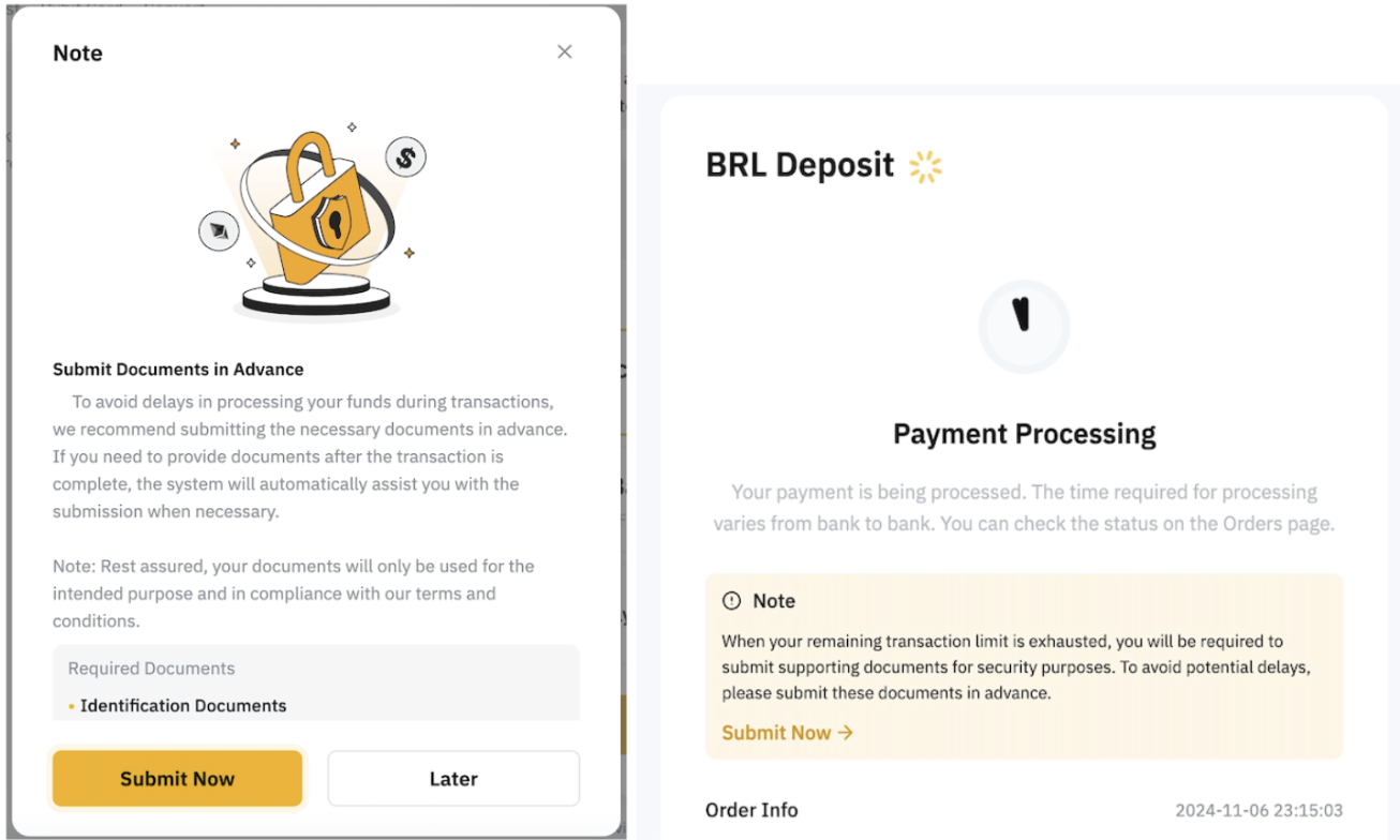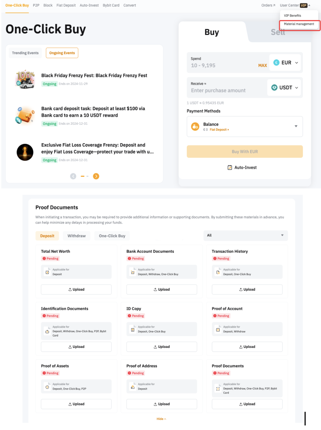 We have designed a collection point for you to pre-submit the required documents. This function helps prevent delays in fund transfers or other impacts on your transaction process due to third-party requirements such as service providers or banking procedures. We recommend that you submit relevant documents in advance through the submission portal by going to the One-Click Buy or Fiat Deposit page → User Center → Materials Management.