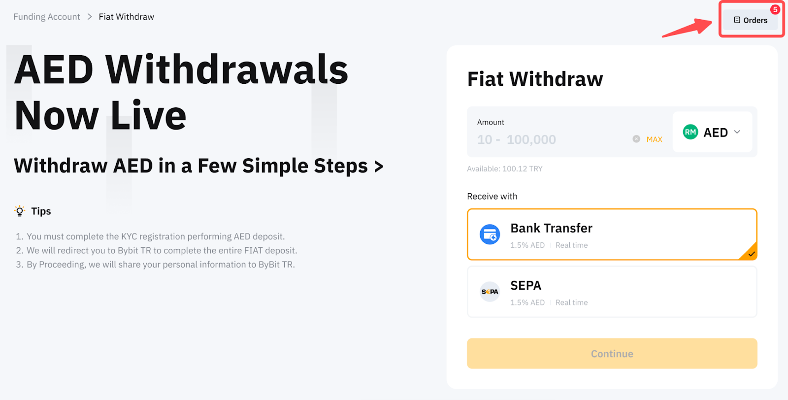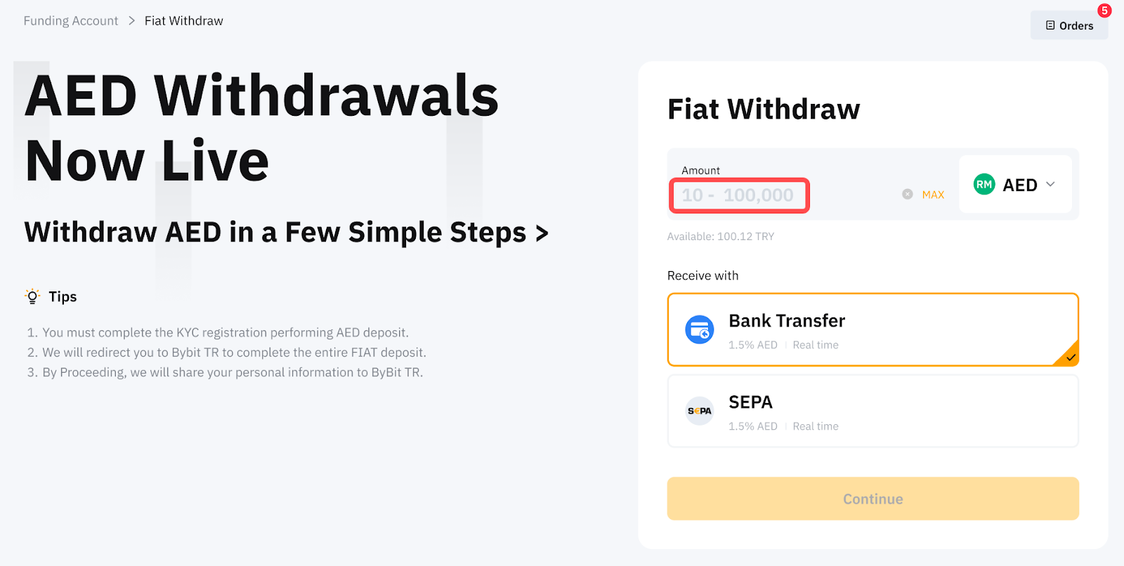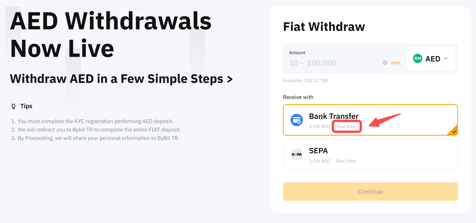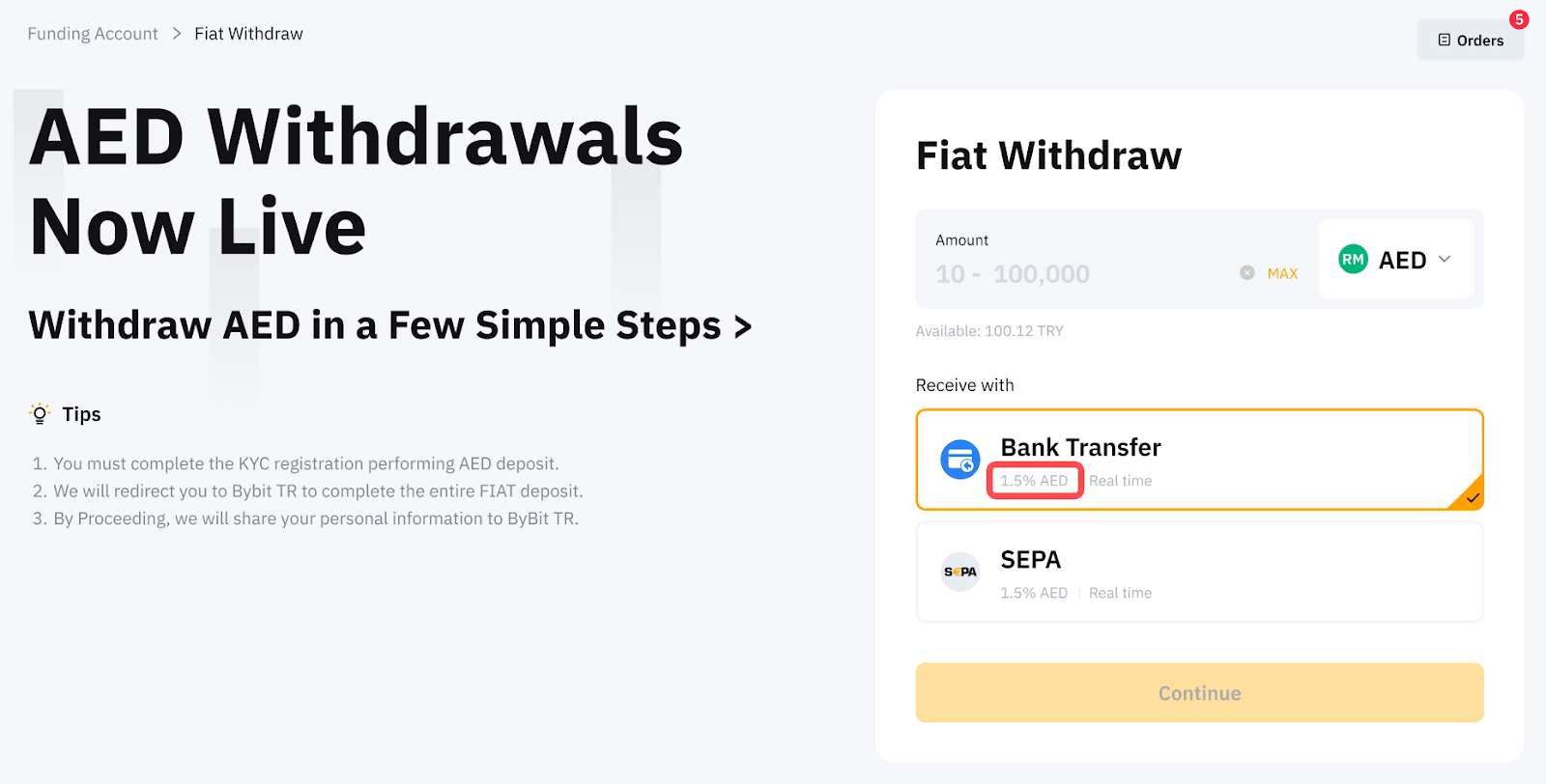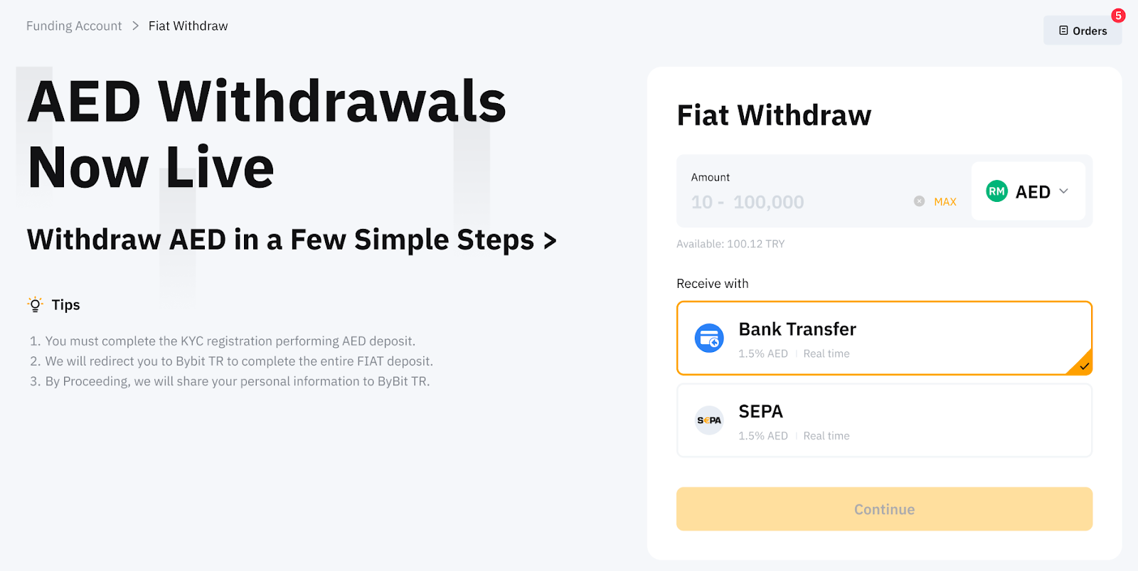Only United Arab Emirates Dirham (AED) currency is available for withdrawal on Bybit.