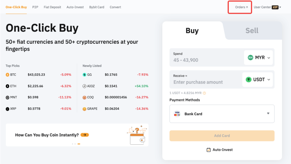 Click on Orders at the upper right corner of the One-Click Buy page to view your order history.