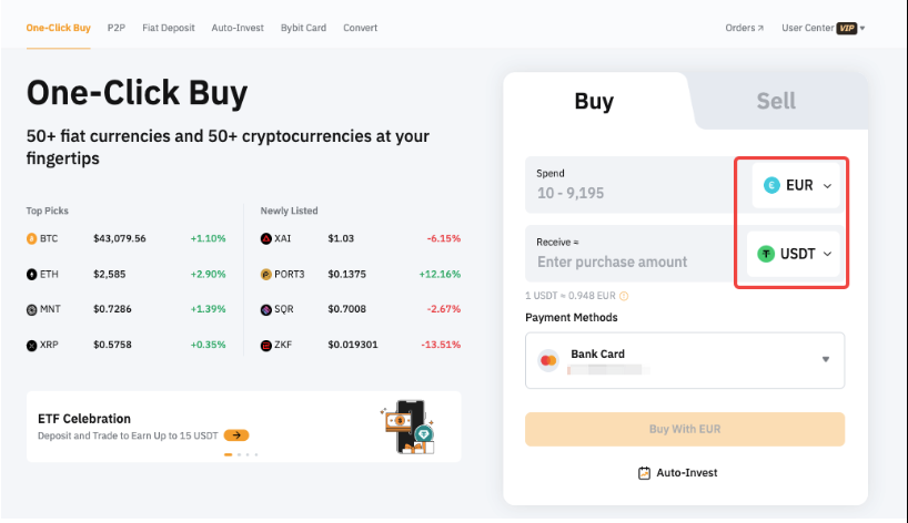 Which fiat currencies and coins are available for purchase through One-Click Buy?