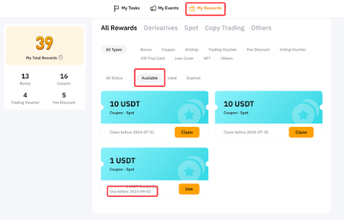 Yes. There is an expiration date for the claimed rewards (excluding airdrop). Any unused rewards after expiration will be forfeited, and no reimbursement will be made. You can check the valid date of your claimed rewards from the My Rewards page.