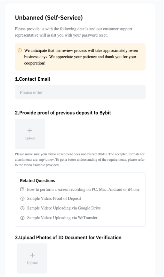 However, if any suspicious activity is detected, you will be redirected to a Self-Service Unban page. There, you will need to follow the steps below to submit certain documents for review.