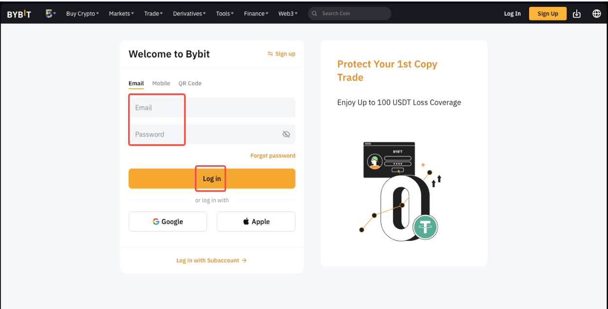 Step 1: Go to the Bybit Web Login page and enter the credentials of the deactivated account. Then, click on Log in.