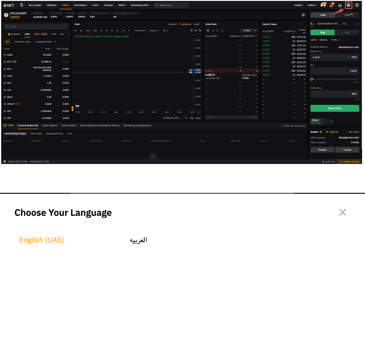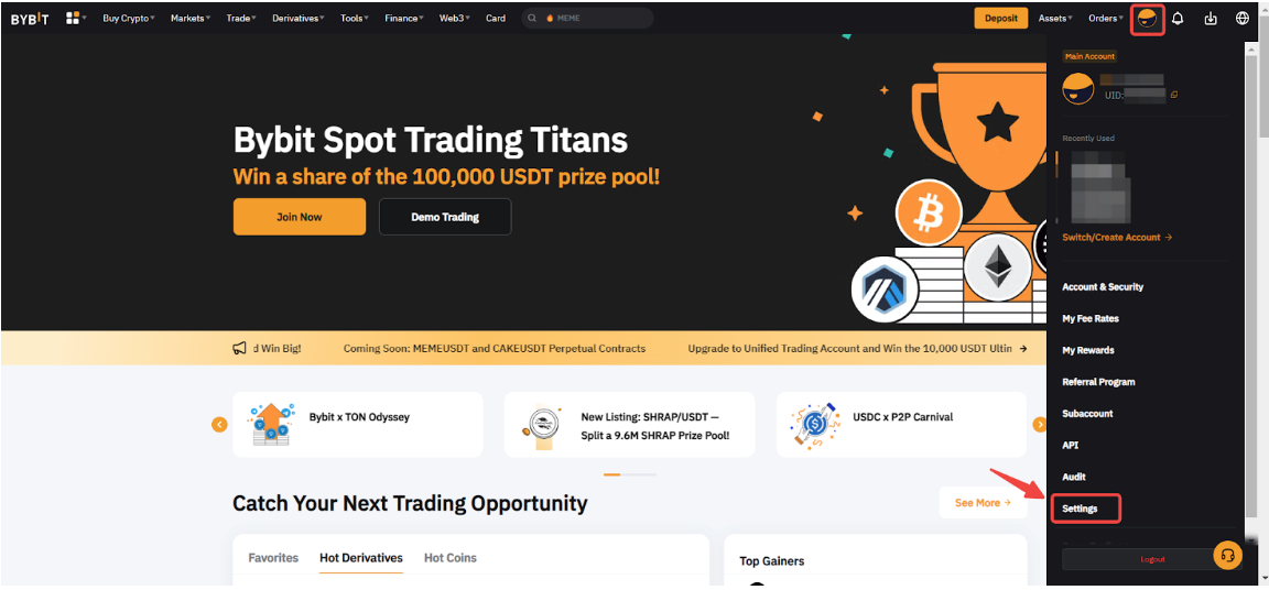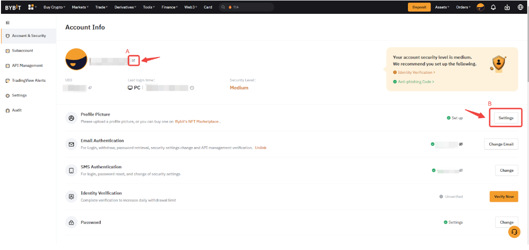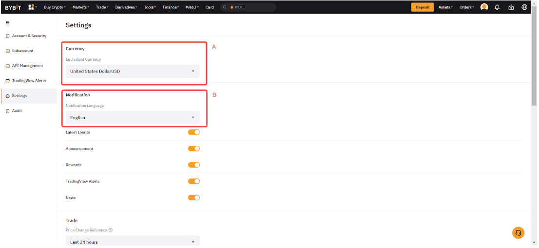 Step 2: Select your preferred currency (A) for display on the Bybit website. This currency will be used to give you an estimate of your funds and order amounts to better grasp the value in your account.